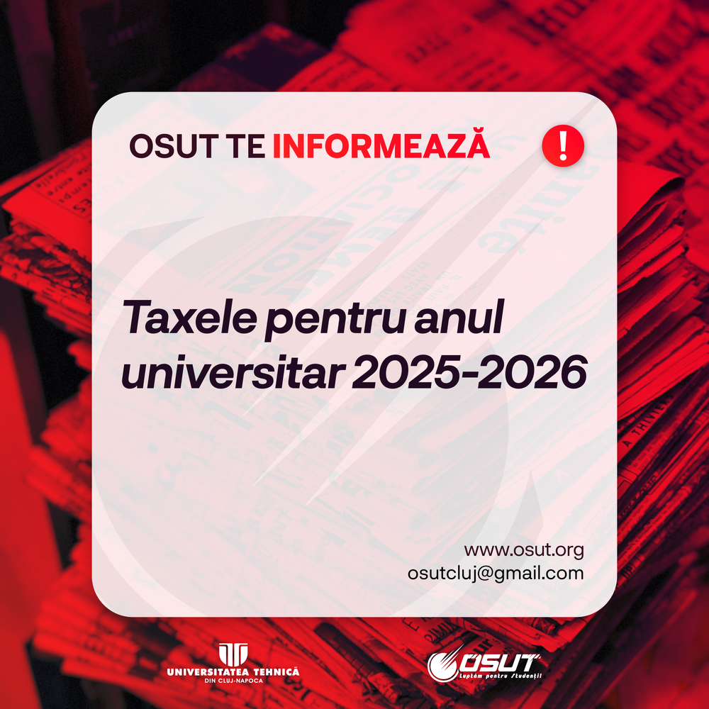 În contextul actual al constrângerilor bugetare la nivel național în domeniul învățământului superior, majorarea anumitor taxe universitare a devenit inevitabilă. În acest cadru, Organizația Studenților din Universitatea Tehnică din Cluj-Napoca (OSUT Cluj), alături de studenții reprezentanți în structurile decizionale ale universității, a fost implicată activ în procesul de consultare și dialog instituțional cu conducerea universității. Ca urmare a acestor demersuri, au fost obținute o serie de ajustări în cadrul noului regulament de taxe, cu efecte directe asupra comunității studențești.